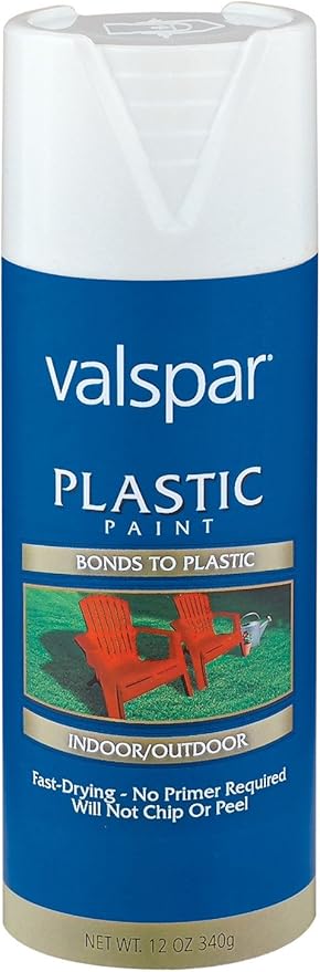 -For rigid plastic surfaces. Valspar plastic spray For rigid plastic surface Decorate and renew common household plastics Use for exterior. Use it on tables or stools indoors or for outdoor lawn and patio chairs. 788 H x 263 W x 263 D. Valspar Plastic paint can be used to paint outdoor chairs and tables and plastic play and storage equipment to refresh or change the color. Ideal for indoor and outdoor plastic you can apply this Rust-Oleum product to many surfaces including PVC fiberglass resin polypropylene polystyrene and vinyl plastics. Available in a dead flat matt sheen perfect for creating a statement with new or upcycled furniture. Valspar spray paint colors product 1. Product Title Valspar 21924 Anti-Rust Enamel Spray Paint Gloss B.