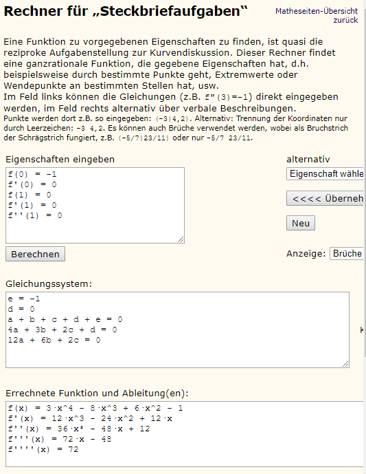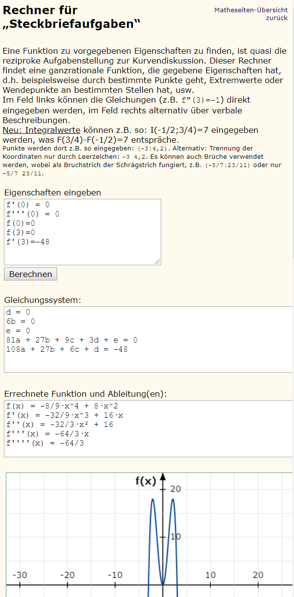Ist aber in meinem LGS kommt nur shidde raus. Die in der Lösung angegebene Gleichung lautet. Bestimmen Sie eine ganzrationale Funktion 4. Grades bestimmen bei der schon 4 Nullstellen vorgegeben sind. Wie kann ich die am besten lösen. Bedingungen aus dem Text erkennen anhand gelernter Mathevokabeln einsetzen in die entsprechenden Gleichungen Gleichungssystem aufstellen und dieses lösenW. Du musst nur noch den Faktor a bestimmen. HttpwwwformelfabrikdeIn diesem Video rechne ich eine Steckbriefaufgabe vor. F x ax 4 bx 3 cx 2 dxe.